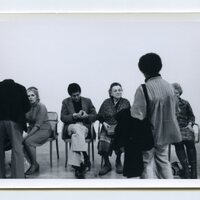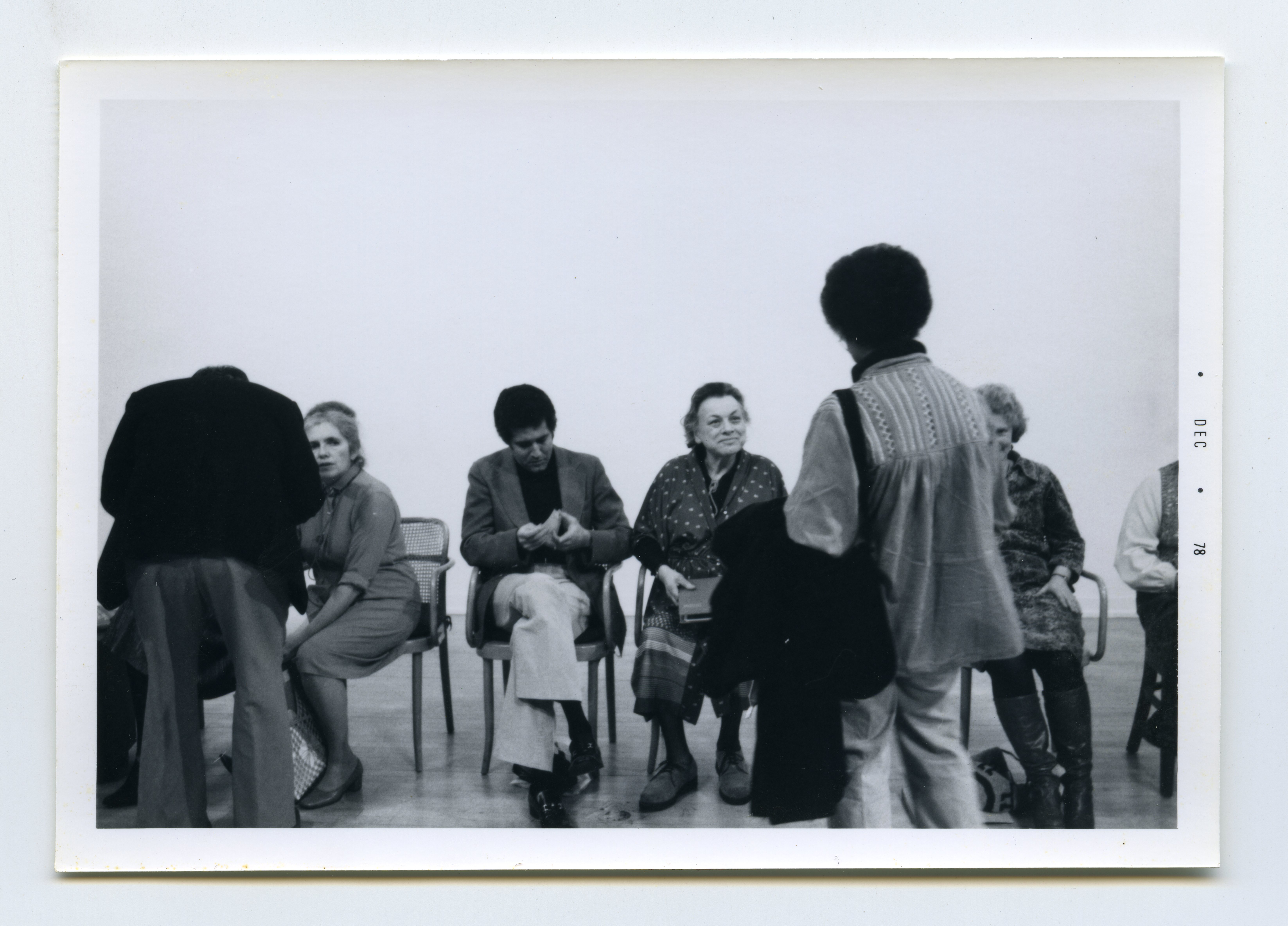 "A day in Honor of Muriel Rukeyser," December 9, 1978, Sarah Lawrence College. Muriel Rukeyser is present in the photograph, sitting with her nephew Louis Rukeyser and the writer Grace Paley to her left and the writer Alice Walker standing to her right, facing her. Alice Walker was a former student of Muriel Rukeyser at Sarah Lawrence College.
