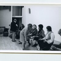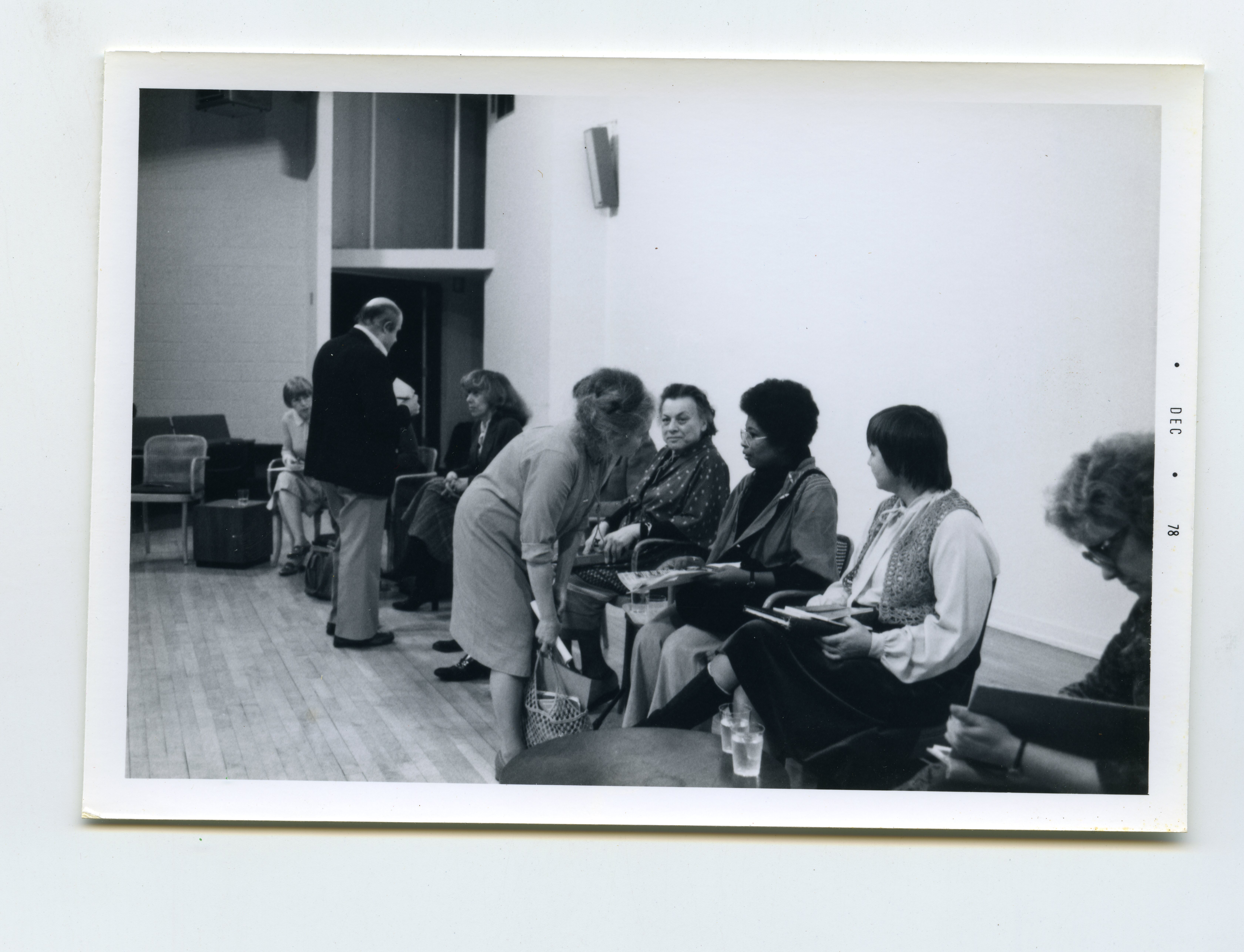 Muriel Rukeyser is present in the photograph, sitting with the writer Alice Walker to her right. Grace Paley appears to be the woman standing in front of Walker and involved in conversation with her. Alice Walker was a former student of Muriel Rukeyser at Sarah Lawrence College.