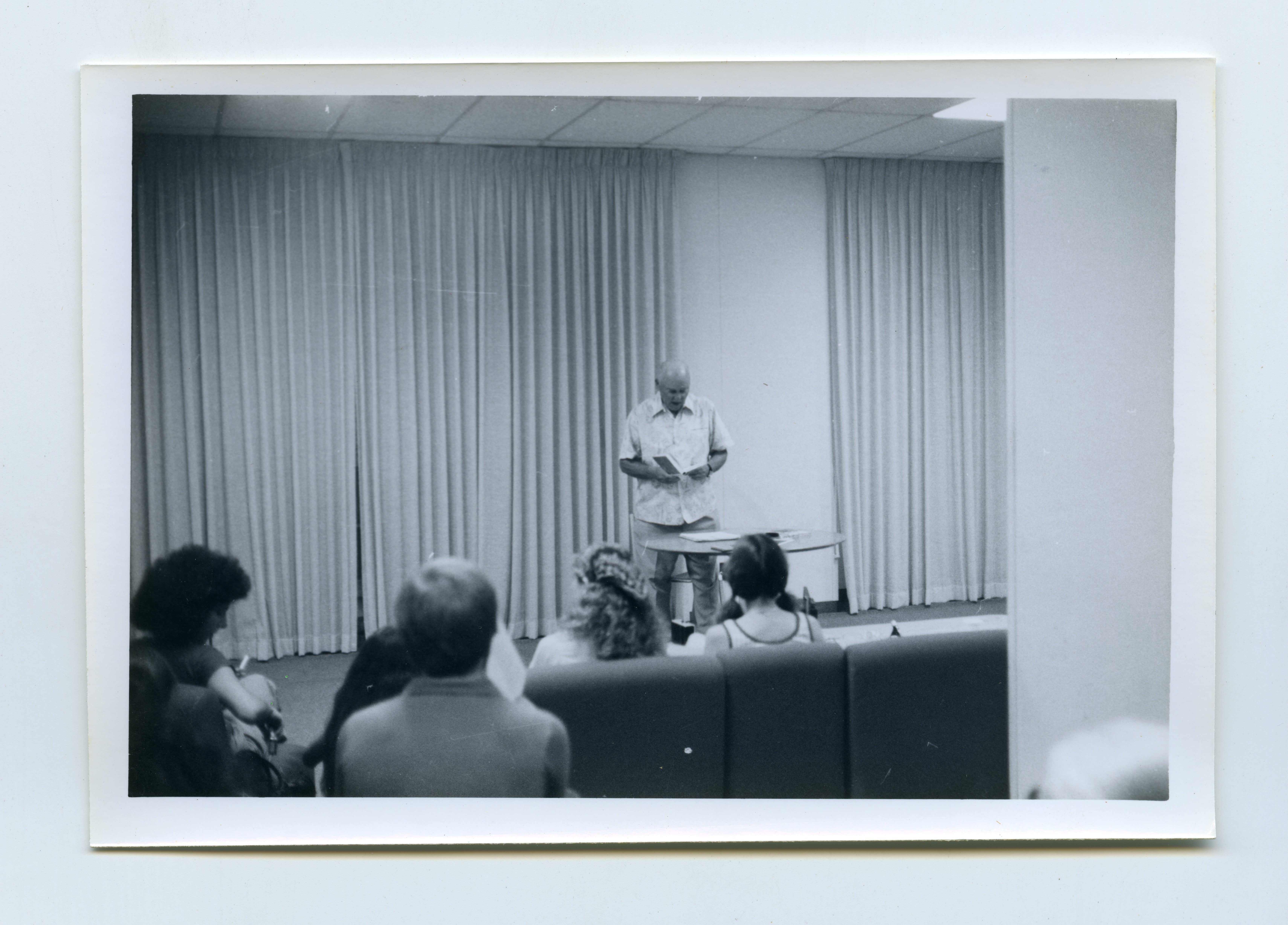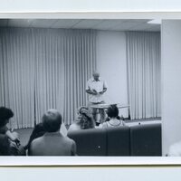 - eng The poet Richard Eberhart stands behind a low table with an open book in front of a small audience of seated individuals, at a poetry event, date and location still to be determined.