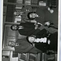 Dated 1954, a photograph of the Bollingen Poetry Prize Selection Committee. A group photograph (from the back row, left to right) Wallace Stevens, Randall Jarrell, Allen Tate. (Front row) Marianne Moore and Muriel Rukeyser.