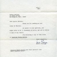 An original, typewritten letter, dated July 7th, 1975. The letter is from Muriel Rukeyser to Louise Kertesz. In the letter, Rukeyser thanks Louise for sending her essay on Thoreau. Rukeyser also provides an answer to Louise’s question [how to access a copy of M.L Rosenthal's 1949 thesis, "Chief Poets of the American Depression: Contributions of Kenneth Fearing, Horace Gregory, and Muriel Rukeyser to Contemporary American Poetry"] and suggests that she write to M.L. Rosenthal at N.Y.U. and ask to borrow a copy of his thesis. Rukeyser ends the letter by saying that she is enclosing a copy of the issue of American Poetry Review that Louise had requested.