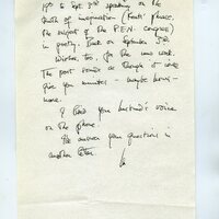 An original handwritten two-page letter to Louise Kertesz from Muriel Rukeyser, dated August 9, 1976. Muriel states that whatever happened to Louise’s daughter is wonderful news, and sends good wishes to Louise and her family. Monica McCall had found reviews of Body of Waking in her office at ICM, along with "the plays." The second part of the letter states that Muriel will be in London from the 19th to September 3rd for the P.E.N. Congress, where she will speak on "the Truth of Imagination" in poetry. Page 2 of 2. The letter is attached with a paper clip to a seventeen-page bundle of Louise's handwritten notes of findings, quotes, observations on Rukeyser. [See documents 018_LK_01_006 to 018_LK_01_023.]