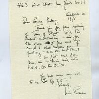 Original handwritten letter, dated October 10th, 1975. The letter is from Muriel Rukeyser to Louise Kertesz. Rukeyser thanks Louise for reading her work, Theory of Flight, "with the deepest understanding - and for the grace of your work." Rukeyser states that she will answer Louise’s questions, and asks if she has sent them. Rukeyser just came back from Korea and is "trying hard, with P.E.N., for Kim Chi Ha." Muriel ends the letter by saying that Louise’s book means a lot to her.