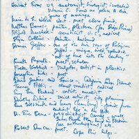 Undated, labeled "San Francisco 1944-1949." Handwritten by Muriel Rukeyser, it contains a list of people whom Muriel was close to and their occupations while she lived in S.F.: Herbert Evans, US anatomist, biologist; Marie de L. Welch, writer, poet, “close friend”; Matthew Barnes, painter, plasterer for Diego Rivera; Alfred Marshak, geneticist, U-C, radical; Glyn Collins, “painter, husband”; Donan Jeffers, “one of the twin sons of Robinson Jeffers–unique, wild, splendid, ‘out of time with the century’”; Kenneth Rexroth, “poet, scholar”; Freda Koblick, “sculptor, artist in plastics; Josephine Miles, poet; David Jenkins and Louise, California Labor School; Thomas Addis, renal scientist, radical; Emmy Lou Packard, artist, muralist; Dorothy Erskine, social activist, city planning; Lena [?] Goldsmith and Nancy Naumburg, “friends from earliest life in New York”; Dr. Eric Berne, psychiatrist Carmel–wrote Games People Play; Robert Duncan, poet. The list is stapled to a postcard from Muriel Rukeyer to Louise Kertesz in which she mentions additional people who “were important to me in California.”
