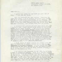 An original, typewritten letter dated October 24th, 1979. The letter is from Louise Kertesz to Muriel Rukeyser. Louise begins the letter by saying that she had phoned Rukeyser earlier today, but she was told that Rukeyser was out of town. Louise hopes that Rukeyser is doing well. Louise asks Rukeyser if she has received the page proofs. The proofs were in such poor shape that Louise requested that she will be the final proofreader for the corrected page proofs. The press went with electronic composition for her book, which is their first experience with computer set type, and they have had many problems. The galleys were full of errors. Louise received the reviews that Rukeyser had sent her a few weeks ago, and she wonders how she could answer them, since her book is an answer to all of these reviews. Louise was particularly shocked at William Prichard’s review in The Hudson Review, and amazed at the “...shallowness, the stupidity I encountered from time to time in reading past reviews of your books.” "There is a rich vein of that running in contemporary 'criticism.'” Louise then states that B.R. Cohen, in [her?] review in the Buffalo Newspaper "didn’t read attentively, and seems to be paraphrasing recent reviews of your books." Louise sent copies of these reviews to Michael True who said he would try to place a review of her book in The Chronicle of Higher Education. True will see that the reviews that Rukeyser sent Louise are like several others documented in Louise’s book. Louise hopes that True will reference these reviews in his review of Louise’s book. She is also mailing to Rukeyser at her 50th St. address a copy of Moving to Detroit. There is a shorter version at 90 pages. Louise is now querying publishers, with a sampling of the poems. Louisiana didn’t want the manuscript, saying only that it was too long. It took five and a half months for them to say that. Perhaps they didn’t want to offend Louise, but Louise is sure that Rukeyser will be more candid. She is looking forward to Rukeyser’s response, when she gets time to read it. Louise ends the letter by saying that she is thinking of Rukeyser, and she hopes that all is well.