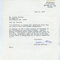 Dated June 23rd, 1976. A typed letter from William Phillips of Partisan Review to Louise Kertesz: “It’s difficult to answer your questions since they all seem to have some hidden assumptions.”