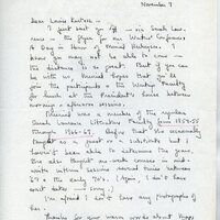 Dated November 7th. While no year is mentioned, the letter was obviously written in 1978. A handwritten letter from Jane Cooper to Louise Kertesz. Cooper talks about a Writer’s Conference: A Day in Honor of Muriel Rukeyser [December 9, 1978 at Sarah Lawrence University] that she hopes Kertesz will attend. Cooper regrets not having any photographs of Muriel. The letter is underlined in red (most likely by LK) in some places.