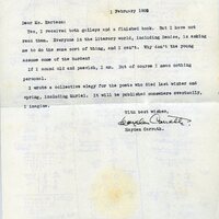 Envelope dated February 2nd, 1981, while the letter is dated February 1st, 1980, and then corrected to 1981. The typewritten letter is to Louise Kertesz from Hayden Carruth from the English Department of Syracuse University. Carruth acknowledges that he received both galleys and the finished book, and that everybody in the literary world, including Denise [Levertov] is pushing him to do the "same sort of thing," but he can’t. He also states that he wrote a collective elegy for the poets who died last winter and spring, including Muriel, and that it will be published somewhere soon. Noteworthy lines: “Why don’t the young assume some of the burden? If I sound old and peevish, I am. But of course I mean nothing personal.”