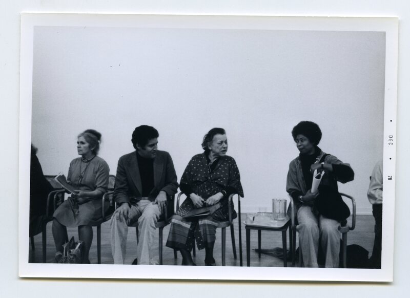 “A day in Honor of Muriel Rukeyser," December 9, 1978, Sarah Lawrence College. Muriel Rukeyser is present in the photograph, sitting with her nephew Louis Rukeyser and the writer Grace Paley to her left and the writer Alice Walker to her right. Alice Walker was a former student of Muriel Rukeyser at Sarah Lawrence College.