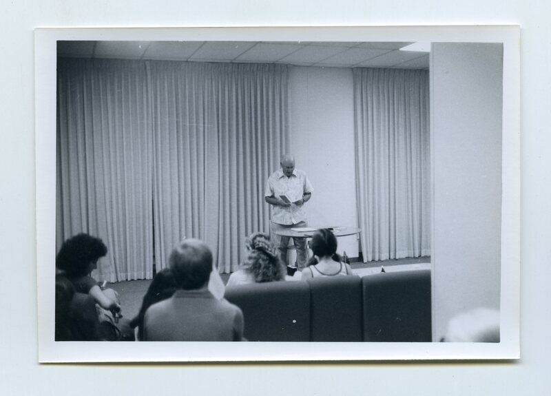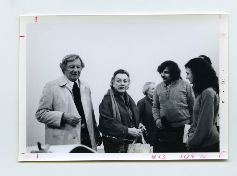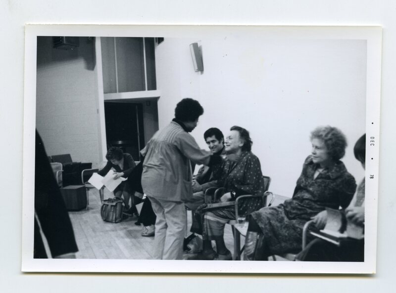 “A day in Honor of Muriel Rukeyser," December 9, 1978, Sarah Lawrence College. Muriel Rukeyser is present in the photograph, sitting with her nephew Louis Rukeyser to her left, and the writer Alice Walker standing and facing Rukeyser. Alice Walker was a former student of Muriel Rukeyser at Sarah Lawrence College.