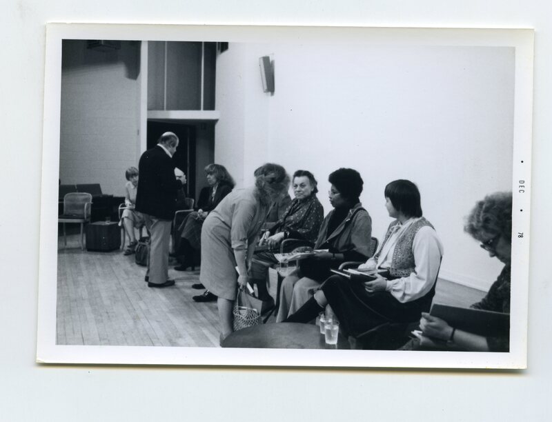 “A day in Honor of Muriel Rukeyser," December 9, 1978, Sarah Lawrence College. Muriel Rukeyser is present in the photograph, sitting with the writer Alice Walker to her right. Alice Walker was a former student of Muriel Rukeyser at Sarah Lawrence College.