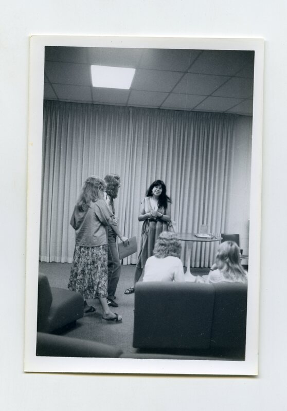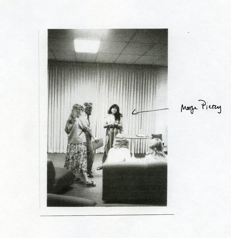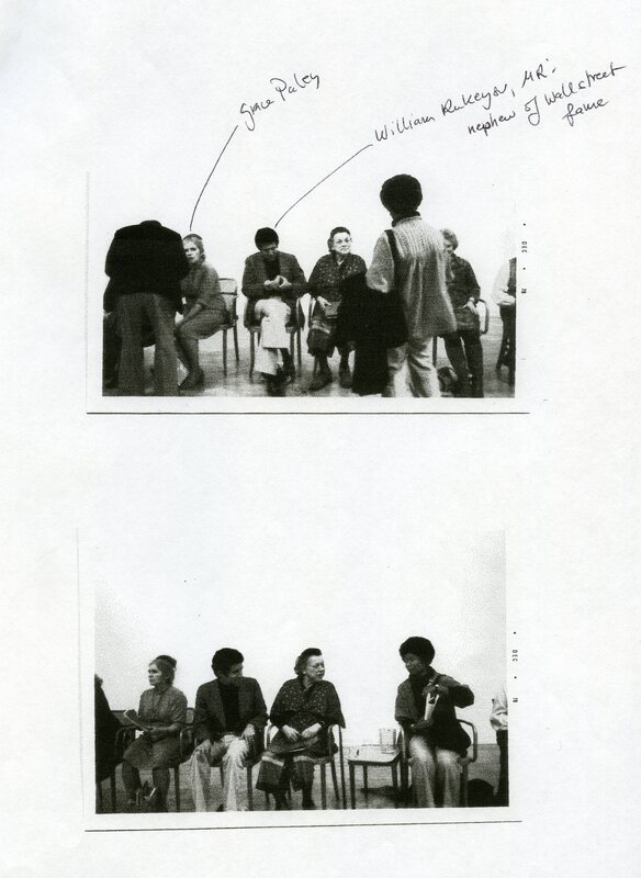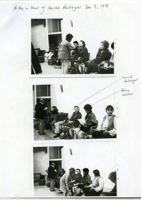Muriel Rukeyser is present in the photograph, sitting with the writer Alice Walker to her right. Grace Paley appears to be the woman standing in front of Walker and involved in conversation with her. Alice Walker was a former student of Muriel Rukeyser at Sarah Lawrence College.