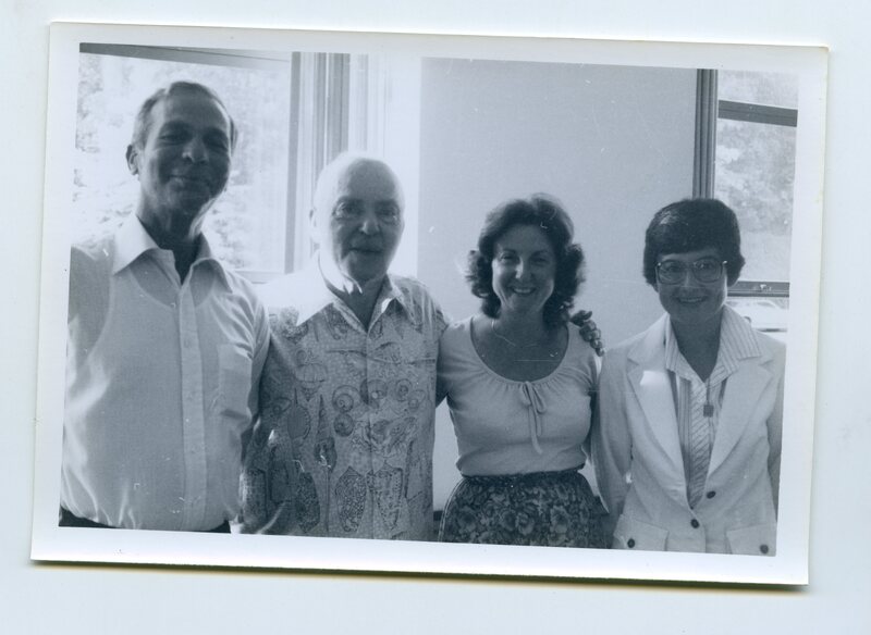 "A day in Honor of Muriel Rukeyser," December 9, 1978, Sarah Lawrence College. Muriel Rukeyser is present in the photograph, sitting with her nephew Louis Rukeyser and the writer Grace Paley to her left and the writer Alice Walker standing to her right, facing her. Alice Walker was a former student of Muriel Rukeyser at Sarah Lawrence College.