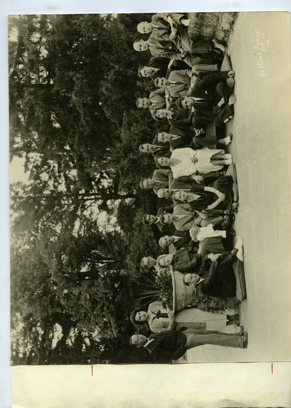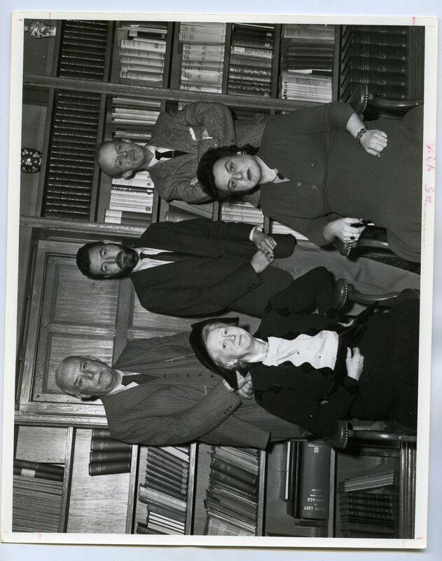 Dated 1954, a photograph of the Bollingen Poetry Prize Selection Committee. A group photograph (from the back row, left to right) Wallace Stevens, Randall Jarrell, Allen Tate. (Front row) Marianne Moore and Muriel Rukeyser.