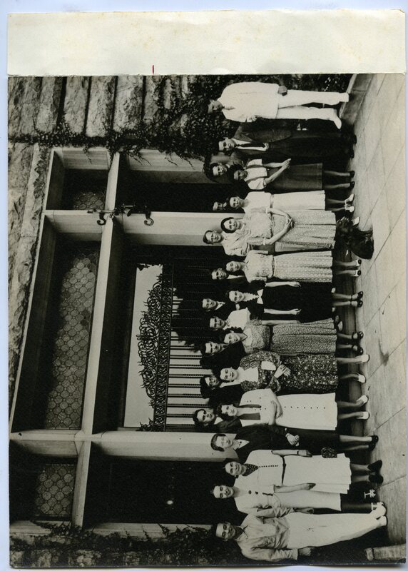 Black and white photograph of Louise Kertesz (pictured far left), her husband Chris Kertesz beside her, and four other individuals, among them Marge Piercy, in conversation with poet Richard Eberhart, at a poetry event, date and location still to be determined.