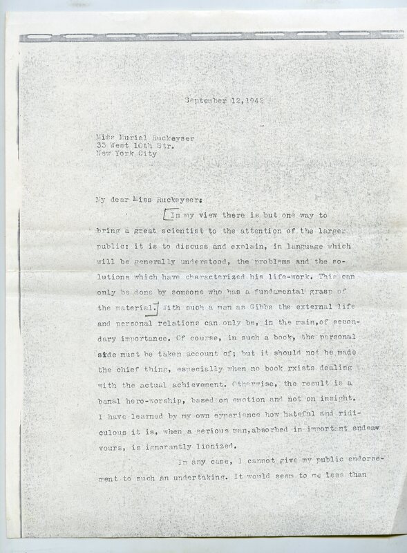 A photocopy of a typewritten two-page letter, dated September 12th, 1942. The letter is from Albert Einstein to Muriel Rukeyser. The background information on this letter is that Muriel Rukeyser had asked Albert Einstein to write a foreword to her biography of the theoretical scientist Willard Gibbs. Rukeyser asked Einstein to “lend his name to her effort to make Gibbs known to a time that needed the story of his achievement." Without reading Rukeyser’s book, Einstein refused, saying that “In my view, there is but one way to bring a great scientist to the attention of the larger public: it is to discuss and explain, in language which will be generally understood, the problems and solutions which have characterized his life-work. This can only be done by someone who has a fundamental grasp of the material.” Einstein acknowledges that "the personal side must be taken account of," but it can’t be the whole focus of the book, or the work becomes “banal hero-worship, based on emotion and not on insight” and that Einstein has learned “by my own experience how hateful and ridiculous it is, when a serious man, absorbed in important endeavors, is ignorantly lionized.” In the end, Einstein refuses Rukeyser’s request, writing that “I cannot give my public endorsement to such an undertaking. It would seem to me less than honourable. That sounds harsh: I even fear that you will take my inability for unjustifiable unkindness. But so I am, and cannot be otherwise.” Kertesz found this letter during her research in the Berg Collection of the New York Public Library. She bracketted the first part of the letter, and attached a sticky note to the back of the paper that says, “Einstein.” Page 1 of 2.
