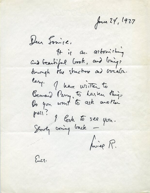 Dated June 24th, 1977. A photocopied handwritten note from Muriel Rukeyser to Louise Kertesz. Rukeyser states that Kertesz's manuscript “is an astonishing and beautiful book, and brings through the structure and vocabulary.”’ Rukeyser had written to Bernard Perry to “hasten things along” and asks if Louise wants her to write to another press. Rukeyser also looks forward to seeing Louise. Her final words, "Slowly coming back," refer to her recovery from her second stroke.