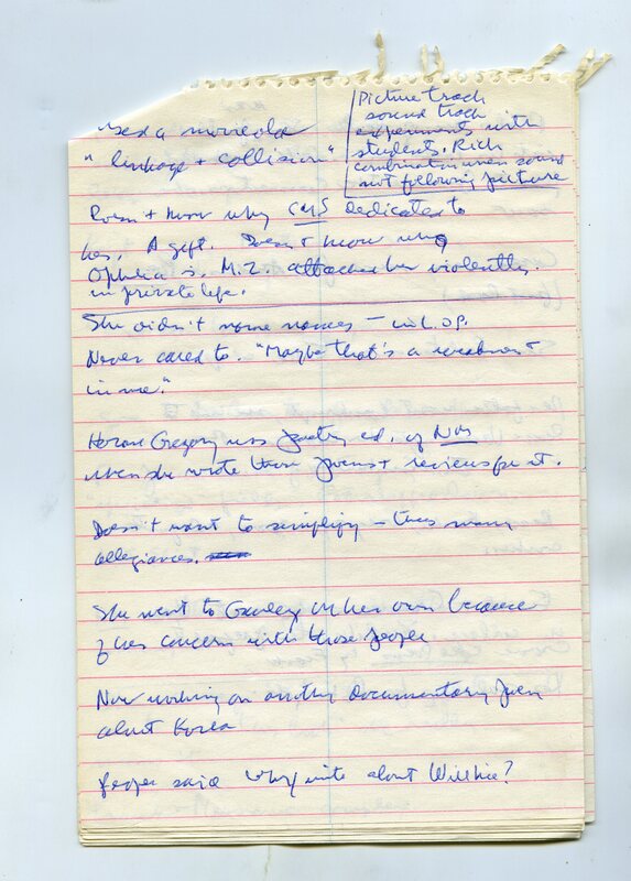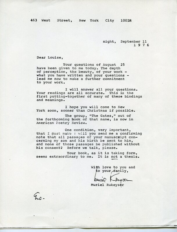 Dated September 11th, 1976. A typewritten note From Muriel Rukeyser to Louise Kertesz. Muriel had received Louise’s questions on August 25th, and she praises “The depth of perception, the beauty, of your work - what you have written and your questions - lead me now to make a further commitment to your work.” There is “one condition, very important, that I must make: will you send me a confirming note that all passages in your manuscript concerning my son and his birth be sent to him, and none of those passages be published without his consent?” Muriel ends by saying, “Your book, as it is taking form, seems extraordinary to me. It is not a thesis.”