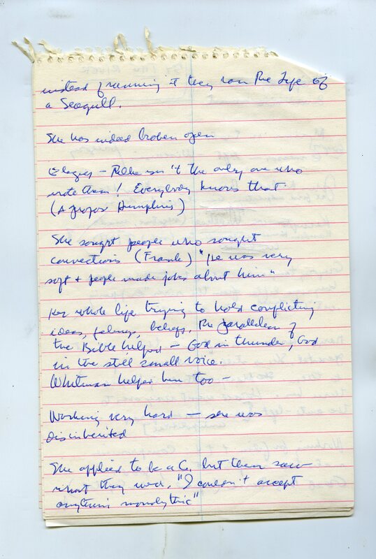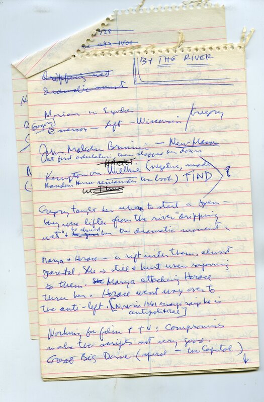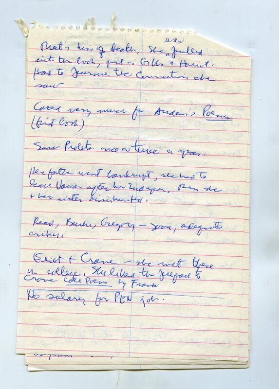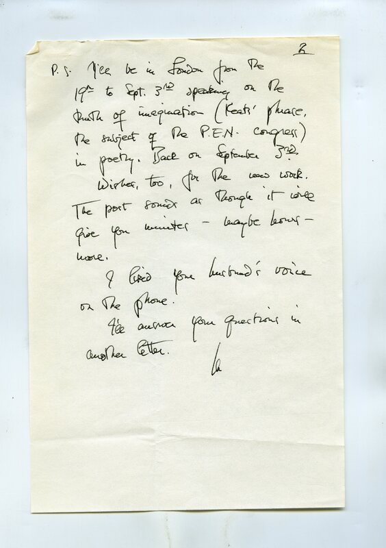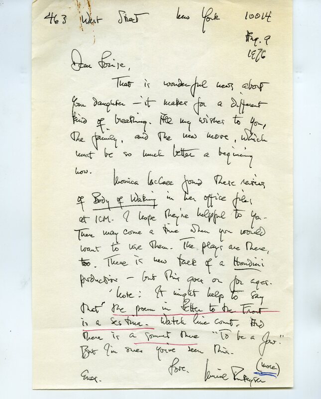 An original handwritten two-page letter to Louise Kertesz from Muriel Rukeyser, dated August 9, 1976. Muriel states that whatever happened to Louise’s daughter is wonderful news, and sends good wishes to Louise and her family. Monica McCall had found reviews of Body of Waking in her office at ICM, along with "the plays." The second part of the letter states that Muriel will be in London from the 19th to September 3rd for the P.E.N. Congress, where she will speak on "the Truth of Imagination" in poetry. Page 2 of 2. The letter is attached with a paper clip to a seventeen-page bundle of Louise's handwritten notes of findings, quotes, observations on Rukeyser. [See documents 018_LK_01_006 to 018_LK_01_023.]