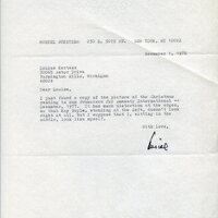 Original, typewritten letter, dated November 1, 1978. The letter is from Muriel Rukeyser to Louise Kertesz. In the letter, Rukeyser tells Louise that she found a copy of the picture of the Christmas reading in San Francisco for Amnesty International in December of 1977. The picture is distorted at the edges, so that Kay Boyle, who was standing on the left of Rukeyser, "doesn't look right at all," but Rukeyser supposes "that I, sitting in the middle, look like myself."
