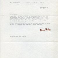 Original, typewritten letter, dated December 20th, 1977. The letter is from Muriel Rukeyser to Louise Kertesz. Rukeyser thanks Louise for her letter. She will be glad to see Louise on January 2nd for as long as she can manage. Muriel hopes that Louise’s husband will come in for a drink afterwards, Muriel doesn’t want to make dinner plans, but wants to meet Louise a little bit the next day at 50th Street. Rukeyser had written to the FBI for her dossier, and she hopes it will arrive in time for their meeting. Rukeyser ends the letter by wishing Louise a Happy New Year.